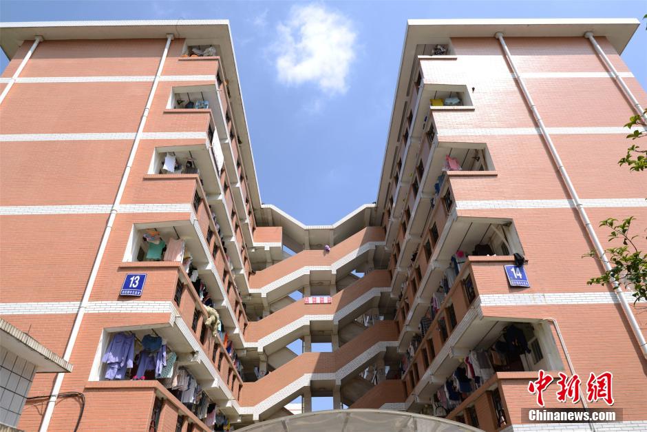 2014年9月21日,广西南宁市,在广西大学校园里面有一栋奇特的学生宿舍楼层建筑。楼层之间通过一个双向楼梯层层相连,连连相扣。这栋建筑的奇特之处在于它是两栋学生宿舍建筑连起来的楼层建筑,总共有6层,从中间楼梯上去,两栋楼之间都可以通过同一个楼梯互相通行。中新社发 任风 摄 图片来源:CNSPHOTO