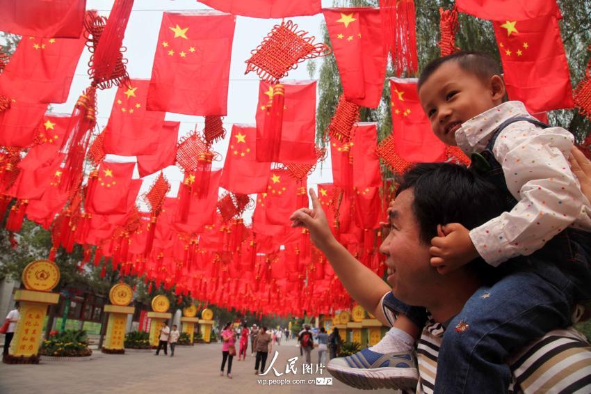 2014年9月21日,北京八大处公园内高悬的五星红旗和中国结喜迎八方来客。北京西山八大处文化节将于9月29日至10月19日举行,文化节活动期间,公园拟推出“欢度国庆 重阳敬老”系列文化活动和“万物平等 世界大同”佛教文化系列活动。