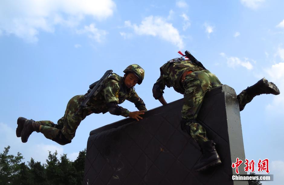 9月24日,由中国公安部边防管理局组织的岗位技能比武暨军体竞赛在广东公安边防总队训练基地进行,来自新疆、西藏、内蒙古、云南、广西、上海等32个公安边防总队的军事指挥、特战和体育精英参赛,共展开实弹射击、武装越野、防暴弹投掷、特战小组协同突击、铁人三项赛等23个项目的比拼,强化官兵固守边防以及反恐、处置突发事件的能力。中新社发 陈文 摄