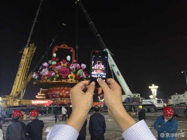 京华时报:【天安门大花篮吊装完成可抗10级大风】为迎接国庆节,今夜,天安门广场大花篮从七点四十开始吊装,八点四十完成。此前北京市花木有限公司董事长张兰年接受媒体采访时称,天安门地区摆花,是不可以向下打基础的,只能做配重,经过工人处理,天安门大花篮可抗10级大风。