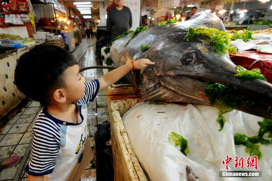 9月24日,一条3.06米长、412斤重的巨型“箭鱼王”被摆到了超市摊档上。据了解,昨日午夜,积米崖渔港出海捕鱼的渔民在黄海捕获了这条“箭鱼王”。