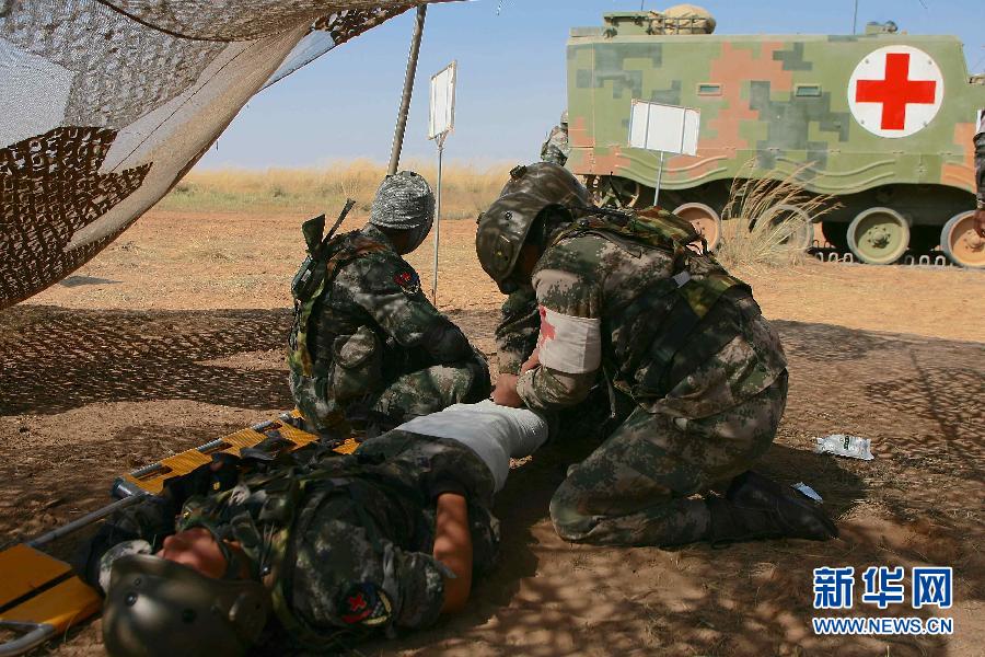 据悉,这次演习的规模和实战化程度均超过以往,参演兵力4000余人,动用各型飞机、装甲车等1000余架台。“红军”由陆军第38集团军某红军团扮演,对抗我军第一支专业化“蓝军”——北京军区某机步旅,真正实现作战牵引卫勤,卫勤紧跟作战。新华社记者 逯阳 摄