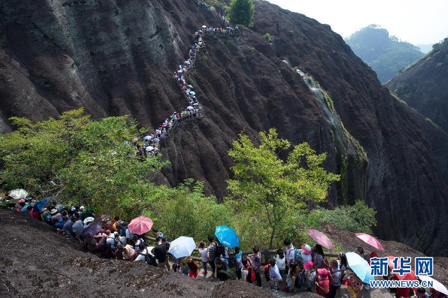 9月1日-30日,为期一个月的“一元门票游武夷”活动即将落幕。 9月本是武夷山旅游淡季,而 “一元门票游武夷” 试行以来,游客蜂拥而至。据武夷山旅游局提供的数据显示,9月1日至27日,武夷山全市共接待游客111.14万人,与去年同期相比增长93.09%,其中主景区接待游客人数达46.14万人,与去年同期相比增长129.62%。客流的增加,直接带动了交通、住宿、餐饮等相关产业的发展。 新华社记者 张国俊 摄 图片来源:新华网