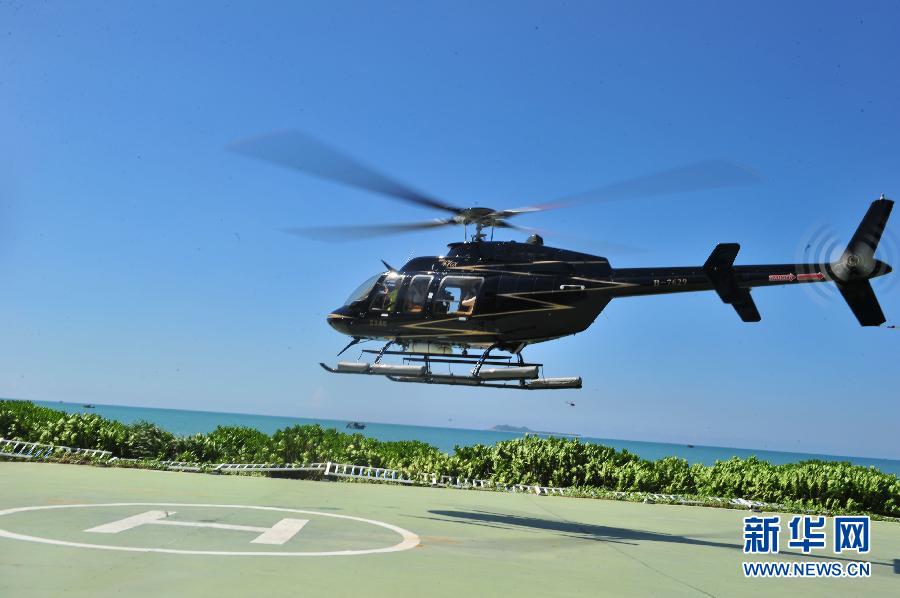 为迎接即将到来的十一黄金周,三亚亚龙通用航空公司斥资3000万新近引进一架美国贝尔407型7座直升机,为游客打造海陆空的立体旅游体验,至此该公司用于低空旅游的各型直升机已达到11架。新华社发(沙晓峰 摄)