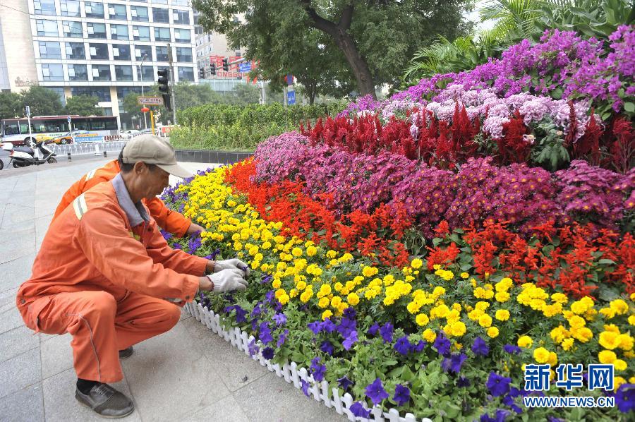 9月28日,工人在北京市东城区龙潭街道辖区内布置花坛。