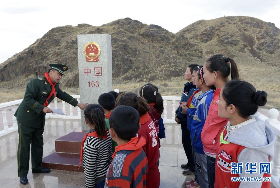 乌拉斯台边检站警官为北塔山牧场寄宿制学校的学生们讲解163号界碑文化(9月27日摄)。 9月27日,正在新疆乌拉斯台口岸执勤的乌拉斯台边检站官兵邀请北塔山牧场寄宿制学校的小学生们,来到位于中蒙边境的163号界碑前,介绍界碑文化及口岸历史,开展了一堂“热爱伟大祖国建设美好边境”国防教育课。 新华社记者 赵戈 摄