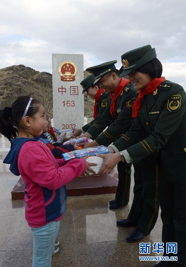 乌拉斯台边检站官兵给北塔山牧场寄宿制学校的学生们赠送学习用品(9月27日摄)。 9月27日,正在新疆乌拉斯台口岸执勤的乌拉斯台边检站官兵邀请北塔山牧场寄宿制学校的小学生们,来到位于中蒙边境的163号界碑前,介绍界碑文化及口岸历史,开展了一堂“热爱伟大祖国建设美好边境”国防教育课。 新华社记者 赵戈 摄
