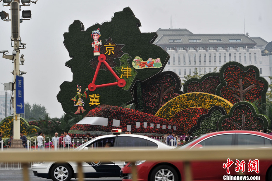 近日,天安门地区管委会组织工作人员在天安门城楼前的南北两侧共157根华灯灯杆悬挂了314面国旗,迎接国庆佳节。这也是长安街西单至东单路段两侧华灯首次悬挂国旗,天安门城楼悬挂的毛主席像也完成了每年一次的更换。长安街沿线的花卉布置也已全部完成,其中摆放在西单路口东北角的国庆立体花坛上,用京剧、皮影和年画等元素串联起来的“京津冀”红三角格外引人瞩目。图为用京剧、皮影和年画等元素串联起来的“京津冀”红三角格外引人瞩目。中新网记者 金硕 摄