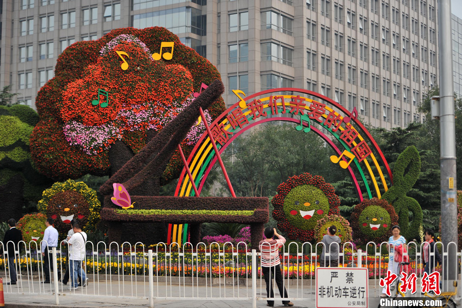近日,天安门地区管委会组织工作人员在天安门城楼前的南北两侧共157根华灯灯杆悬挂了314面国旗,迎接国庆佳节。这也是长安街西单至东单路段两侧华灯首次悬挂国旗,天安门城楼悬挂的毛主席像也完成了每年一次的更换。长安街沿线的花卉布置也已全部完成,其中摆放在西单路口东北角的国庆立体花坛上,用京剧、皮影和年画等元素串联起来的“京津冀”红三角格外引人瞩目。图为长安街上的国庆花坛。中新网记者 金硕 摄