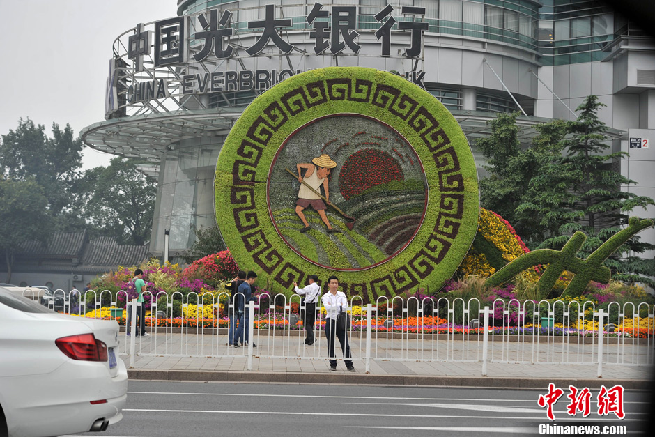 近日,天安门地区管委会组织工作人员在天安门城楼前的南北两侧共157根华灯灯杆悬挂了314面国旗,迎接国庆佳节。这也是长安街西单至东单路段两侧华灯首次悬挂国旗,天安门城楼悬挂的毛主席像也完成了每年一次的更换。长安街沿线的花卉布置也已全部完成,其中摆放在西单路口东北角的国庆立体花坛上,用京剧、皮影和年画等元素串联起来的“京津冀”红三角格外引人瞩目。图为长安街上的国庆花坛。中新网记者 金硕 摄