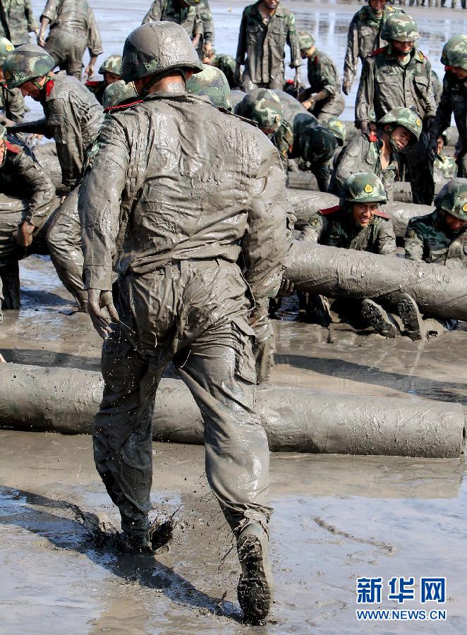 9月28日,武警战士参加极限条件下的体能考核。当日,武警上海总队九支队举行有“魔鬼日”之称的军事技能考核。在设定的缺粮断水条件下,支队官兵通过武装奔袭、负重行军、泥潭搏击等多项极限课目锤炼,战士们的意志、耐力和心理承受力经受了全面的考验。新华社记者 陈飞 摄