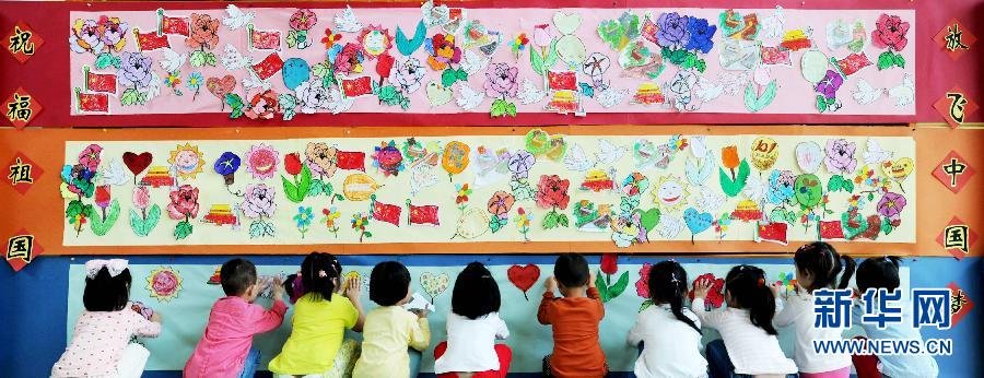 9月30日,江苏苏州平江实验幼儿园的儿童在创作“祝福祖国·放飞中国梦”剪贴画长卷。 “十一”将至,广场上、街道中、画作里……到处都是红旗的海洋,人们以种种方式表达着对祖国的热爱和美好祝福,共迎新中国65周年华诞。新华社发(杭兴微 摄)