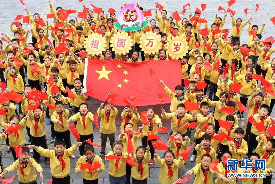 9月30日,河南焦作温县西关小学学生挥舞国旗迎国庆。 “十一”将至,广场上、街道中、画作里……到处都是红旗的海洋,人们以种种方式表达着对祖国的热爱和美好祝福,共迎新中国65周年华诞。新华社发(徐宏星 摄)