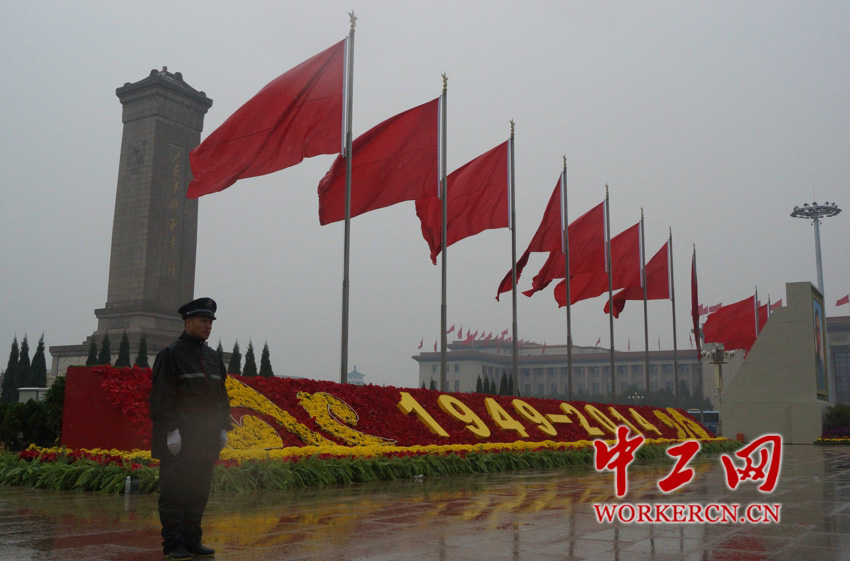2014年10月1日国庆日恰逢新中国65周年华诞。10月1日中午,北京的天空飘起了沥沥淅淅的小雨,但是下雨并不能阻挡群众游览天安门广场的热情。图为雨中的天安门广场。 中工网记者 耿瑜 摄