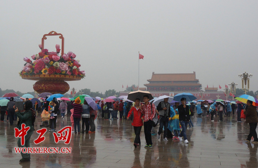 2014年10月1日国庆日恰逢新中国65周年华诞。10月1日中午,北京的天空飘起了沥沥淅淅的小雨,但是下雨并不能阻挡群众游览天安门广场的热情。图为雨中的天安门广场。 中工网记者 耿瑜 摄
