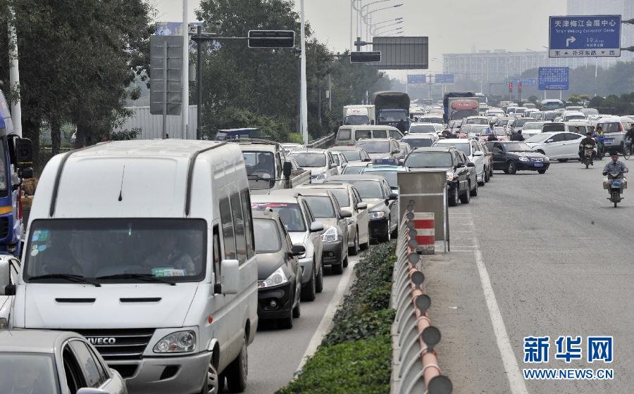10月1日,车辆拥堵在天津外环线的路口上。当日是国庆长假第一天,人们纷纷探亲访友或出游,全国多地出现出行高峰。 新华社记者岳月伟摄