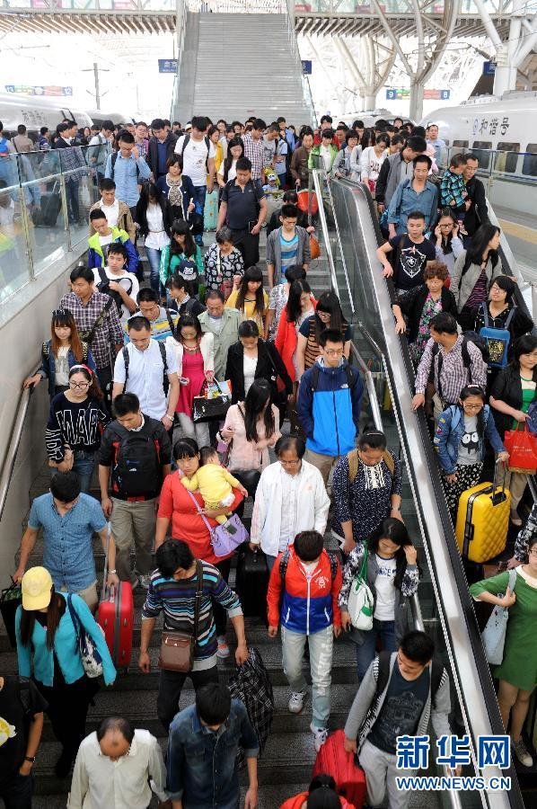 10月1日,旅客在南京站下车出站。当日是国庆长假第一天,人们纷纷探亲访友或出游,全国多地出现出行高峰。 新华社记者孙参摄