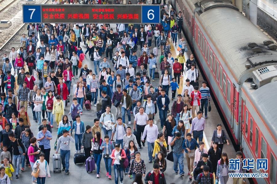 10月1日拍摄的合肥火车站出行的旅客。据合肥火车站介绍,该站预计当天发送旅客16万人次。当日是国庆长假第一天,人们纷纷探亲访友或出游,全国多地出现出行高峰。 新华社记者 杜宇 摄