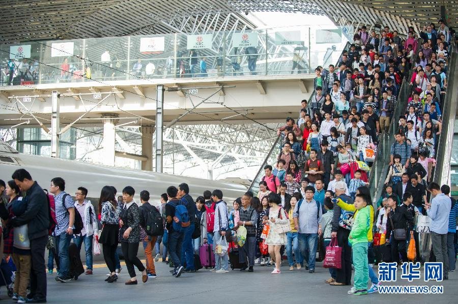 10月1日拍摄的合肥火车站出行的旅客。据合肥火车站介绍,该站预计当天发送旅客16万人次。当日是国庆长假第一天,人们纷纷探亲访友或出游,全国多地出现出行高峰。 新华社记者 杜宇 摄