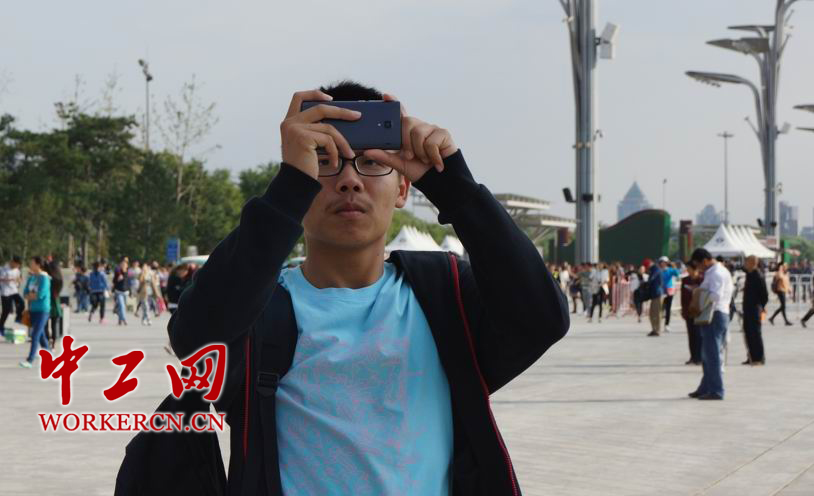 10月2日,国庆节当天的一场大雨后,北京迎来晴朗好天气,北京奥林匹克公园游人如织,游人们在公园里尽情享受休闲时光。图为一名游客在北京奥林匹克公园用手机拍摄。 中工网记者 耿瑜 摄