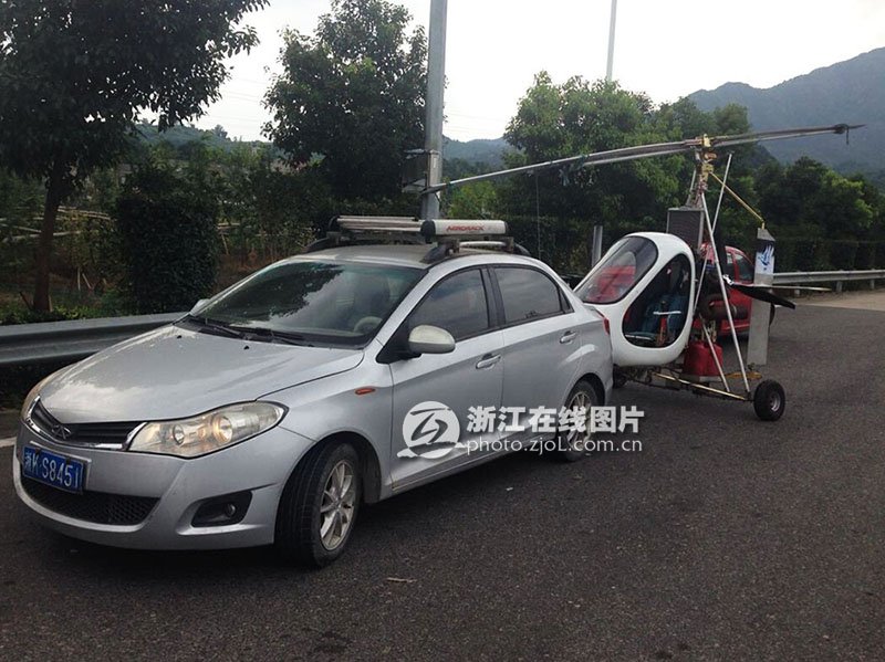 高速交警提醒,运载货物需使用货车,轿车拖拽直升机属于违法托运,交警将对金师傅的行为作出规定处罚。图为轿车拖拽直升机现场。