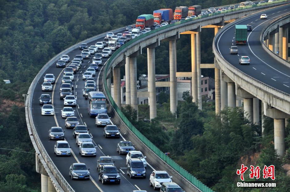 10月5日17时许,江西遂川,大(大庆)广(广州)高速公路遂川县杨公山路段,车辆如织,密密麻麻,缓慢前行。据执勤的交警称:5分钟的车流量高达160多辆。 中新社发 肖远泮 摄