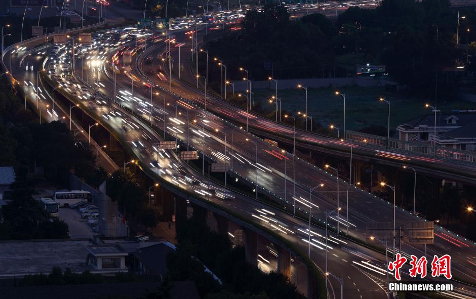 10月6日傍晚,在连接南京市区道路的高架道路上,大批车辆开着车灯缓慢行驶。国庆黄金周接近尾声,外出旅游探亲的民众相继返城,各地开始迎来返程车流高峰。 中新社发 泱波 摄