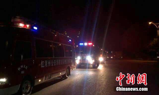 据中国地震台网正式测定:10月7日21时49分在云南省普洱市景谷傣族彝族自治县(北纬23.4度,东经100.5度)发生6.6级地震,震源深度5千米。红河消防14车55人2犬 于23点30分集结完毕出发。 中新社发 钟欣 摄