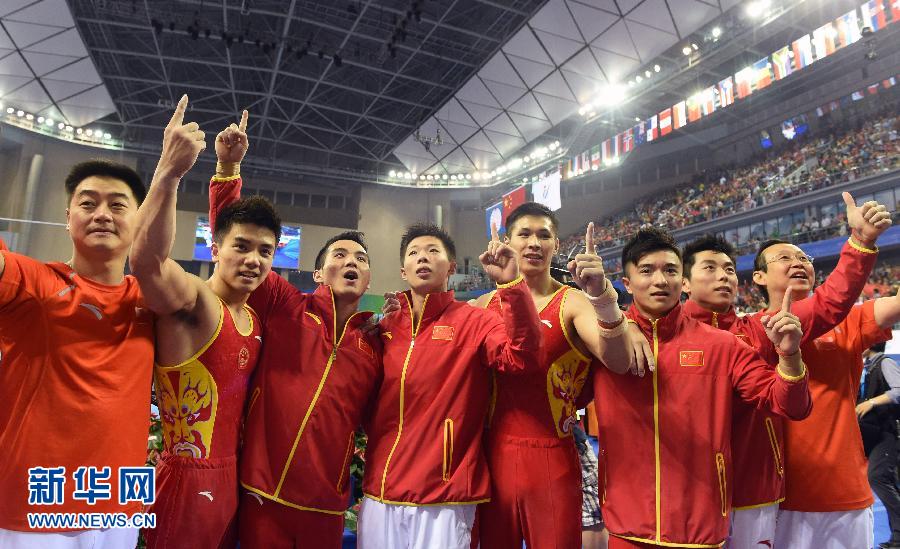 10月7日,中国队在夺得冠军后庆祝。当日,在第45届世界体操锦标赛男子团体决赛中,中国队以273.369的总分夺得男子团体冠军。 新华社记者黄孝邦摄