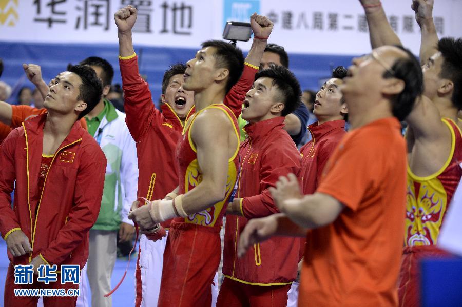 10月7日,中国队选手看到比赛成绩后欢呼庆祝。当日,在第45届世界体操锦标赛男子团体决赛中,中国队以总分273.369的成绩夺得冠军。 新华社记者梁旭摄