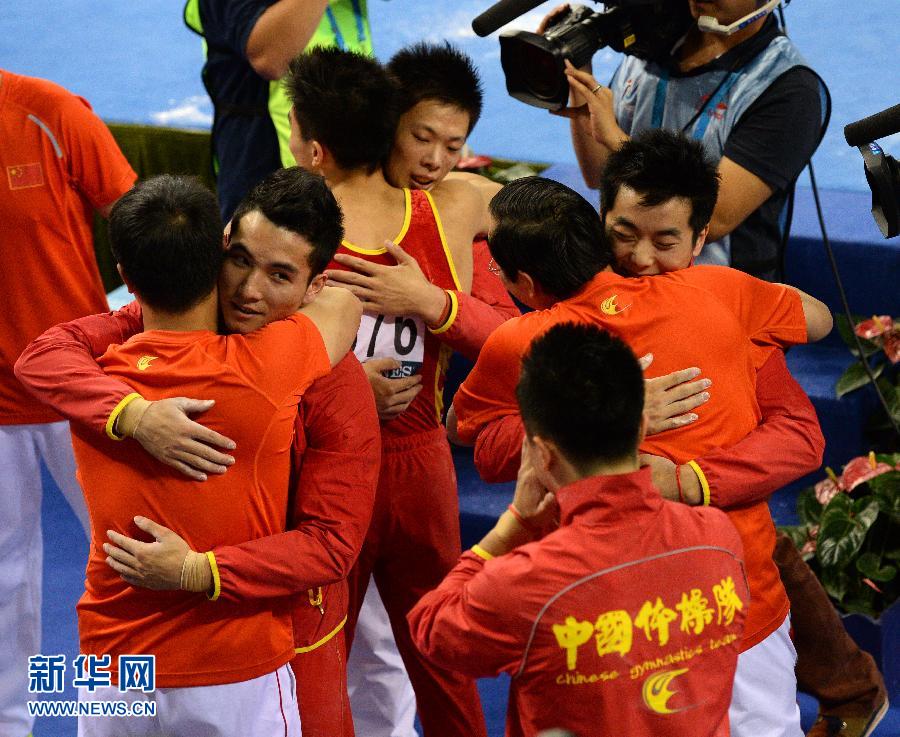 10月7日,中国队在夺得冠军后庆祝。当日,在第45届世界体操锦标赛男子团体决赛中,中国队以总分273.369的成绩夺得冠军。 新华社记者李桥桥摄