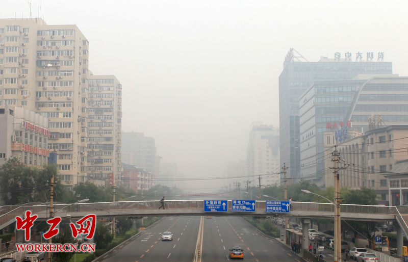 北京市气象台10月8日23时发布大雾黄色预警信号,预计未来三天将持续重度污染状态。图为北京市安定门外大街。 中工网记者 李雪峰 摄