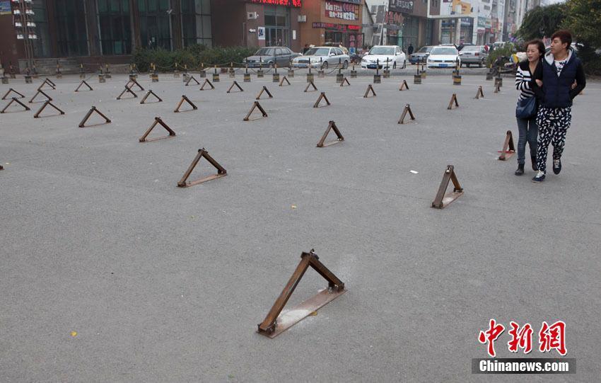 10月9日,市民从长春一布满车位地锁的小区门前走过。