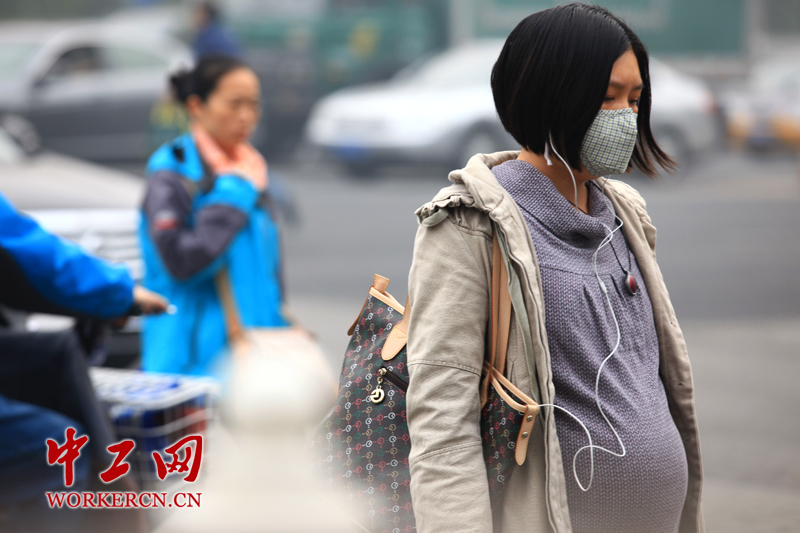 10月10日,据中央气象台预报,北京大部、河北西部等地区有重度雾霾。这是今秋以来北京遭遇连续重度雾霾天气的第二天。严重的雾霾天气给人们的生活和出行等带来了诸多不便。图为一名孕妇带着口罩行走在雾霾中。 中工网记者 李雪峰 摄
