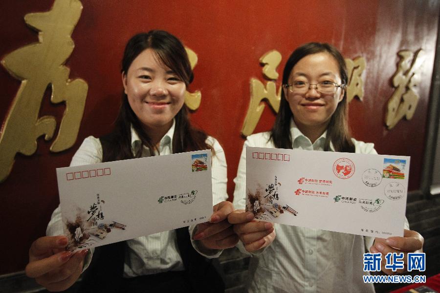 10月10日,“未来邮局”的工作人员在展示专用信封。当日,中国邮政未来邮局大栅栏琉璃厂梦想驿站落成揭幕仪式在北京举行。“未来邮局”驿站将为顾客提供一个记录和传递梦想的平台,顾客可以给2020年的自己或者亲朋好友写信,信件投递之后,收信人将在 2020年收到。 新华社记者 邢广利 摄