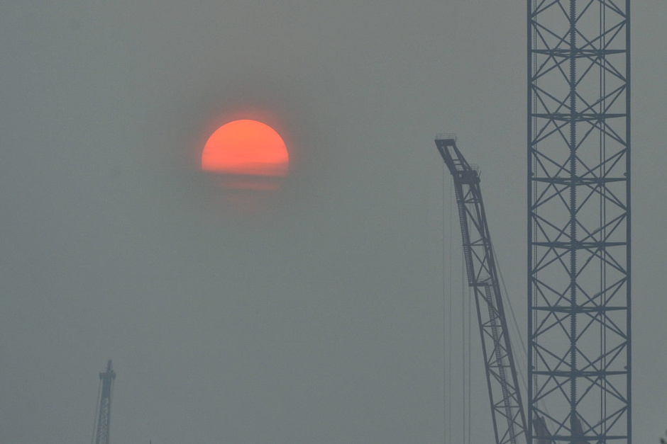 2014年10月08日,一轮初升的太阳在辽宁省大连市雾蒙蒙的天空中显得格外红。