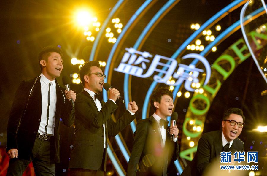 10月10日,撒贝宁、汪涵、何炅、华少(从左到右)在开幕式现场献唱。新华社记者 白禹 摄