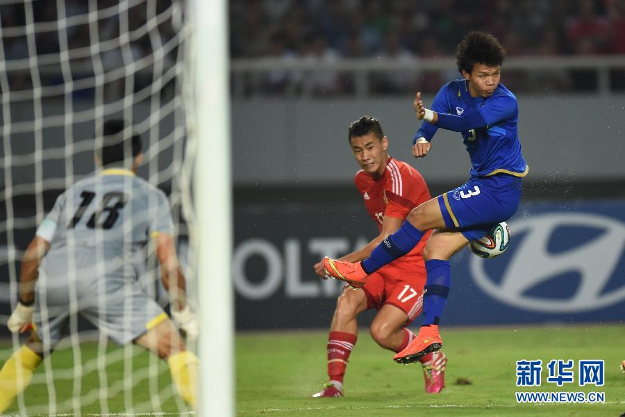 10月10日,泰国队球员苏里亚·兴穆伊(右)在比赛中封堵。当日,在武汉体育中心体育场举行的国际足球友谊赛中,中国国家队以3比0战胜泰国国家队。新华社记者郭勇摄