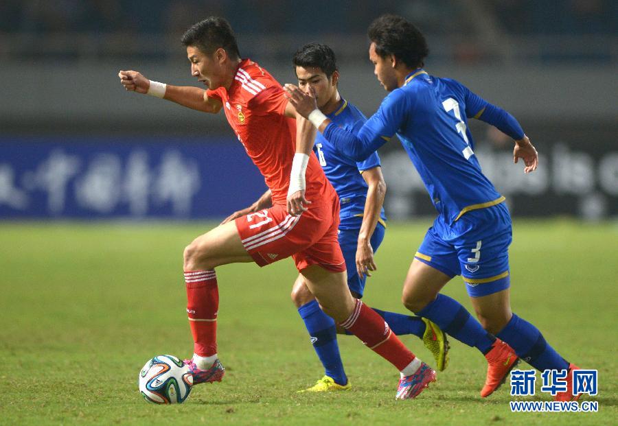 10月10日,中国队球员于海(左)在比赛中突破。当日,在武汉体育中心体育场举行的国际足球友谊赛中,中国国家队以3比0战胜泰国国家队。新华社记者程敏摄