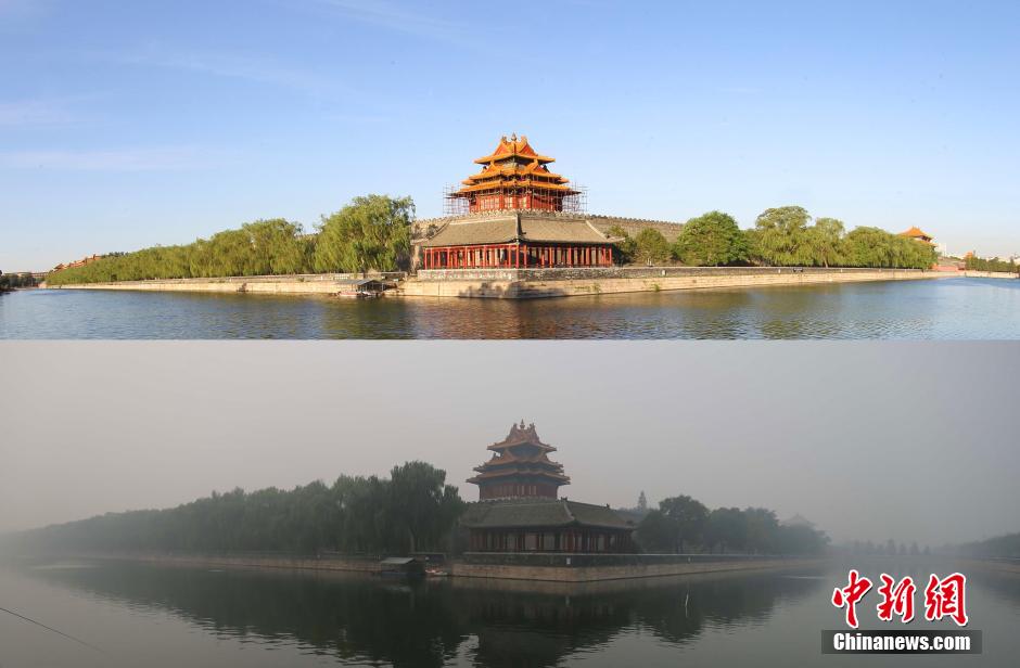 10月10日,北京故宫角楼被雾霾笼罩,与蓝天白天映衬下的故宫角楼形成了鲜明的对比。 中新社发 郭俊锋 摄 图片来源:CNSPHOTO