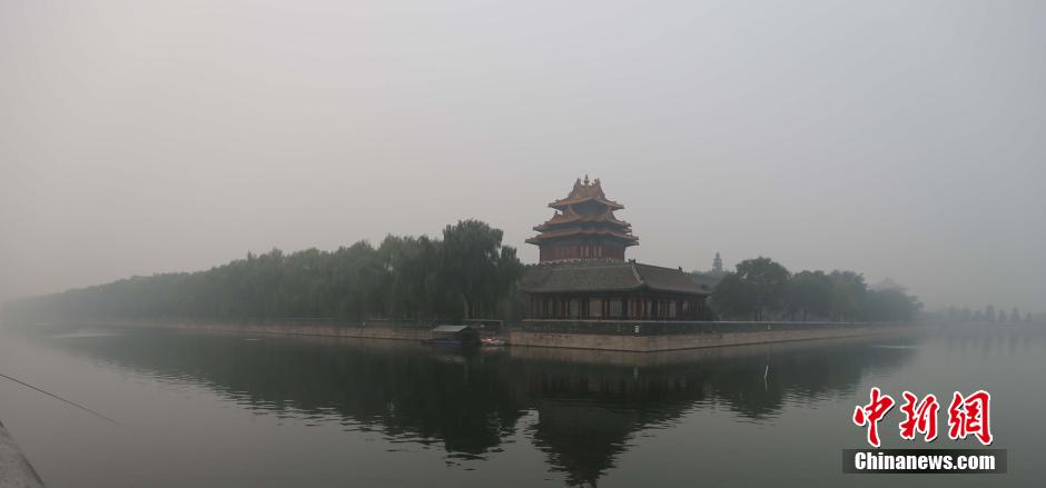 10月10日,北京故宫角楼被雾霾笼罩,与蓝天白天映衬下的故宫角楼形成了鲜明的对比。 中新社发 郭俊锋 摄 图片来源:CNSPHOTO