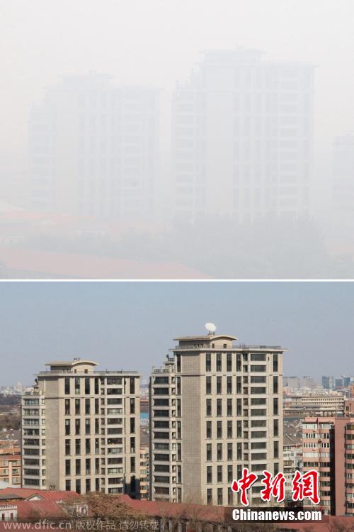 10月10日清晨,北京西城区宣武门附近一片住宅区被雾霾笼罩(上图);2014年2月19日拍摄的同一片住宅区(下图)。