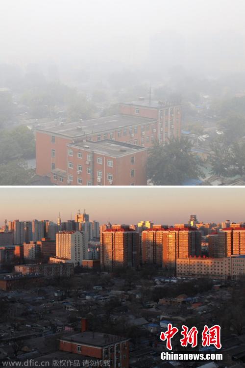 10月10日清晨,北京西城区宣武门附近一片住宅区被雾霾笼罩(上图);2014年2月19日拍摄的同一片住宅区(下图)。 图片来源:东方IC 版权作品 请勿转载