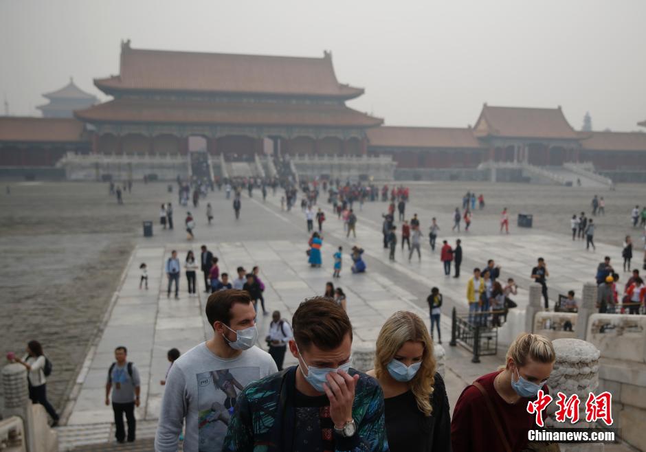10月10日,游客在北京故宫游玩。北京市区空气质量已连续三日达到严重污染级别。中新社发 刘关关 摄