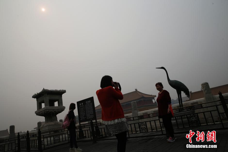 10月10日,游客在北京故宫游玩。北京市区空气质量已连续三日达到严重污染级别。中新社发 刘关关 摄