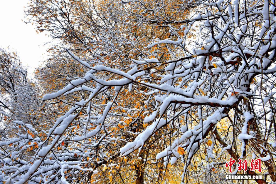 10月10日来,甘肃出现今年入秋以来首场大范围降雪。位于祁连山脚下的甘肃肃南裕固族自治县一片银装素裹,胜似童话传说中的仙境一般美丽。此次降雪使县城驻地红湾寺出现壮丽的雪凇奇景,林中落叶松、樟子松、白桦、河杨等高低错落的树木上,红、青、绿、黄各色叶片与白雪交相辉映,犹如一幅天然的水墨画。武雪峰 摄