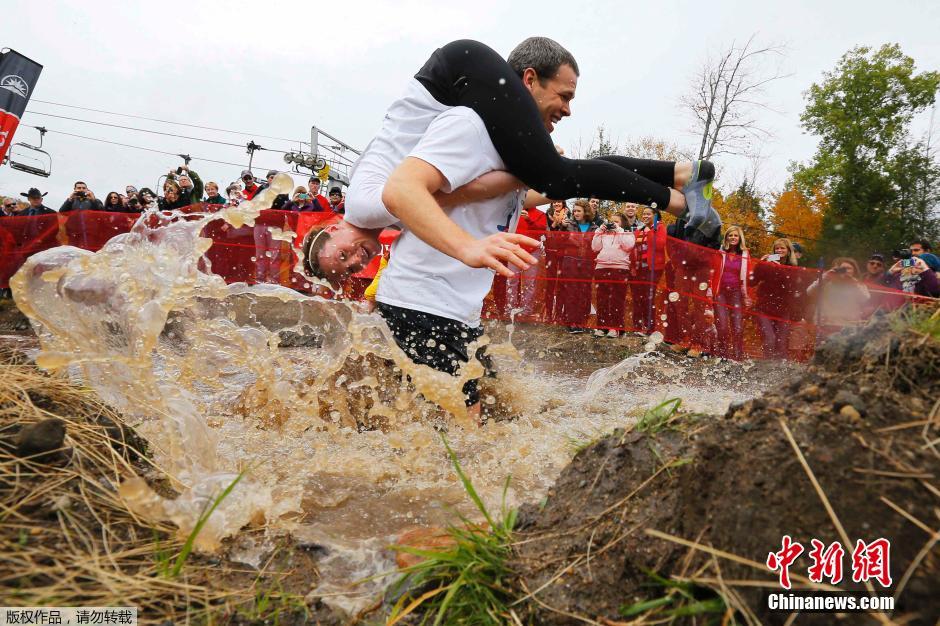 当地时间2014年10月11日,美国缅因州,当地举办“北美背媳妇大赛”,参与者越过重重障碍奋力前行。