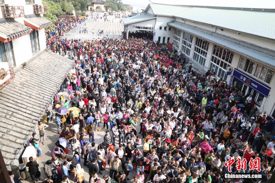 10月10日至10月12日是浙江普陀山香会节,约6.24万游客赶至中国四大佛教名山之一普陀山。但12日,受第19号台风“黄蜂”外围影响,浙江舟山高挂台风黄色预警信号,沿海出现9-11级偏北风,普陀山于12日10点30分开始停航,大量游客滞留普陀山。13日14时,“黄蜂”外围影响减弱,普陀山恢复通航,普陀山民警开始疏散滞留在景区的游客。中新社发 赵苑伊 摄