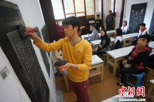 在工作人员演示下,师生们共同学习拓碑技艺。 陈煜 摄