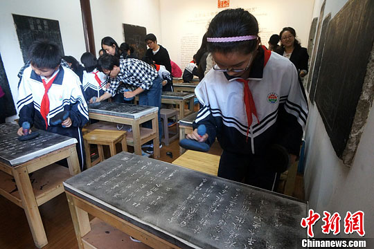 10月15日,苏州市东中市实验小学校组织该校十多位师生走进当地碑刻博物馆,在工作人员的指导下,经过上纸、椎拓,上墨等步骤,对古代诗词进行拓印,学习传统拓碑技艺,感受中国传统文化。